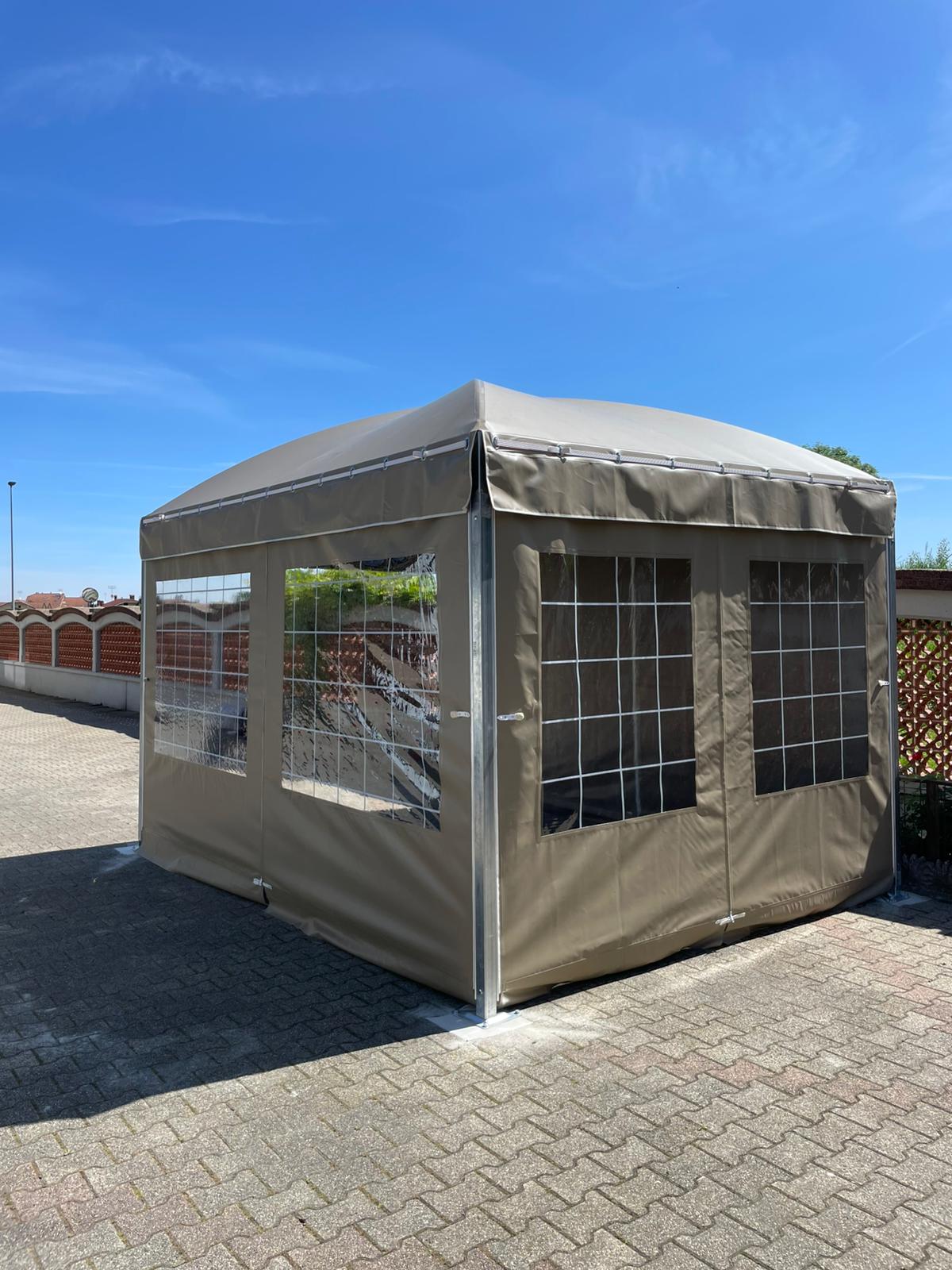 Disponibili anche i "gazebi veloci", con particolare sistema di apertura e chiusura in pochi secondi, particolarmente comodi e pratici per l'uso occasionale o in ambito fieristico.